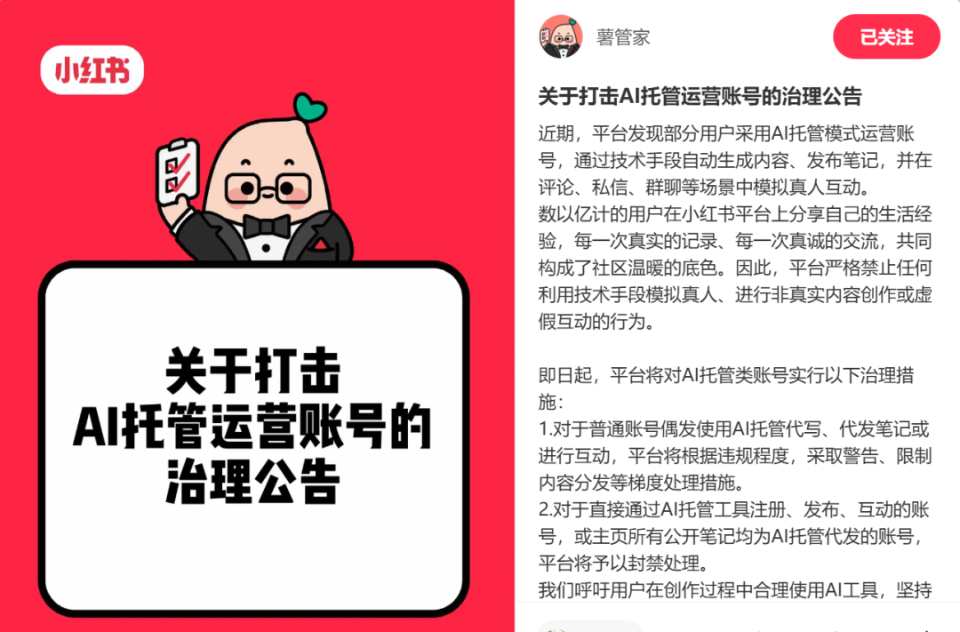 同一天,小红书发布公告,宣布对AI托管账号展开严格治理。