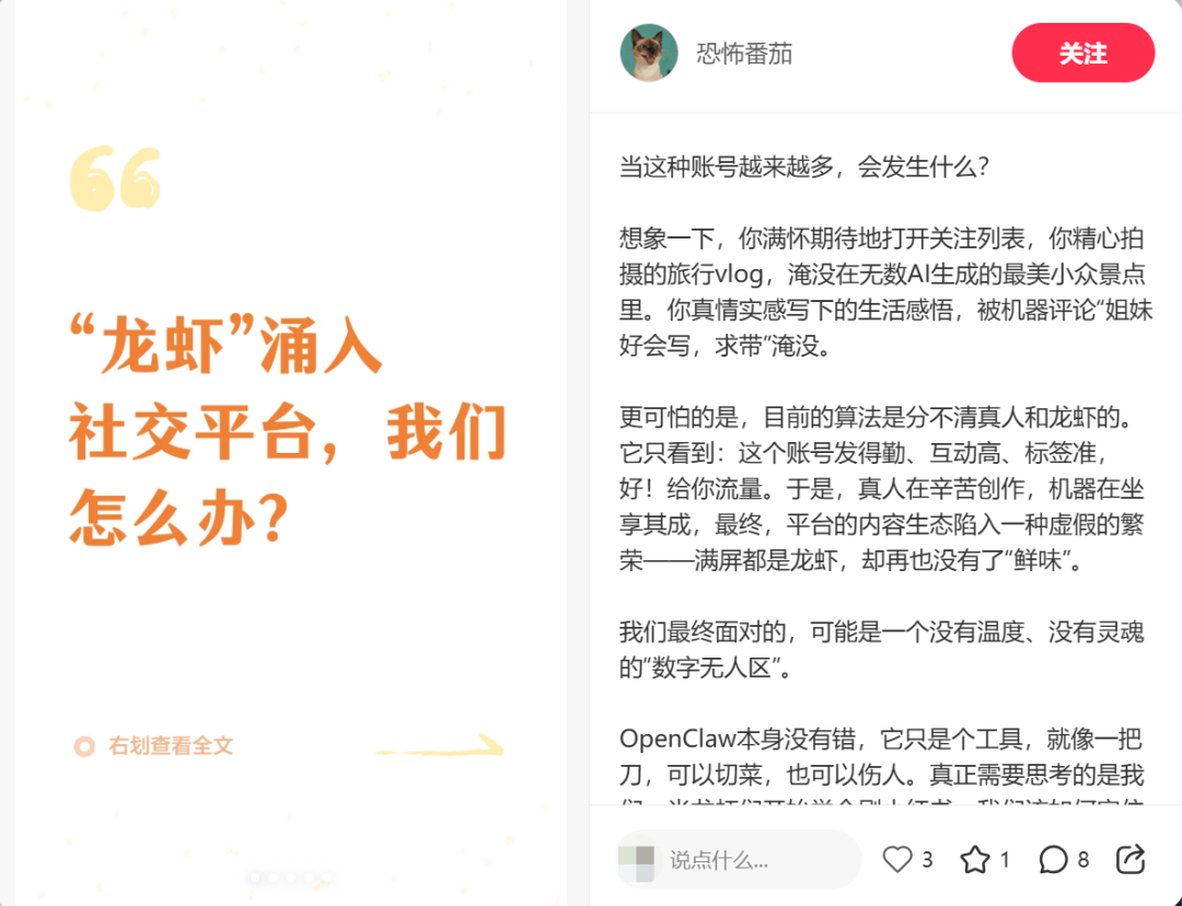 对于依赖UGC(用户生产内容)和信任感的平台而言,这无异于在根基上钻孔。而对人类社会来说,这不仅仅是一个效率和替代的问题,而是一种存在性危机。