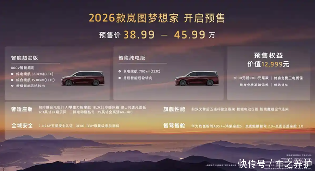 相比于现款搭载了华为乾崑智驾车型35.99万的起售价,2026款岚图梦想家的起售价一下子提升到了38.99万,价格提升的幅度可是不小的,相信正式上市的时候价格可能还会再降一万元,这才是升级了电池、超充以及一些配置的正常价格。